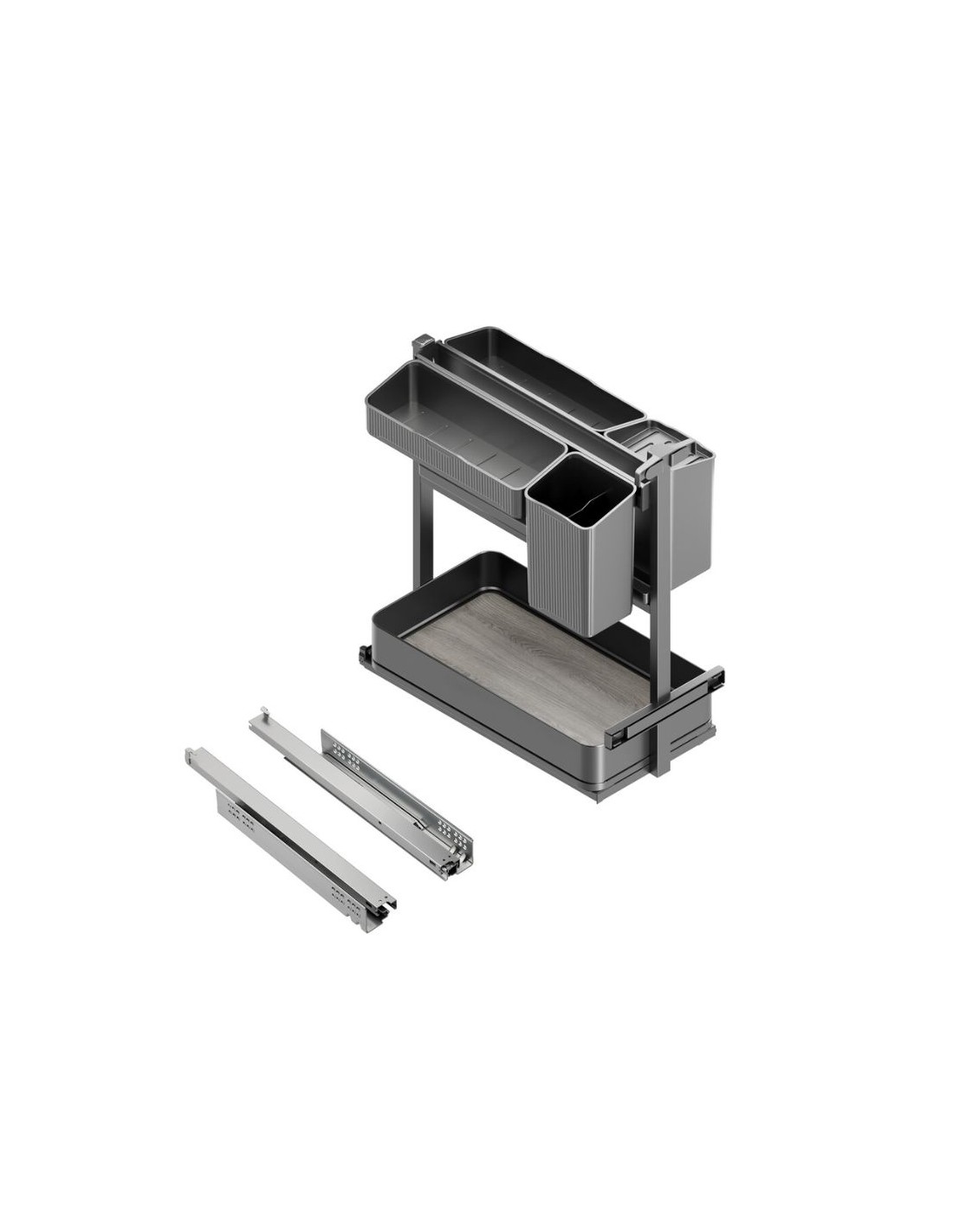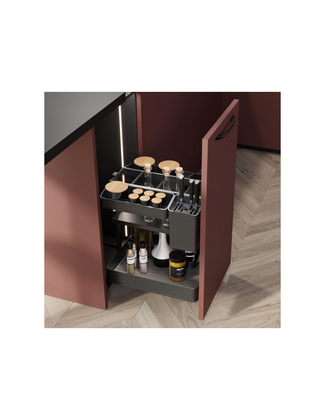- Carro extraíble con bandejas y accesorios, diseñado para maximizar el almacenamiento y aprovechar al máximo el espacio en los muebles de la cocina, ofreciendo una solución estética y funcional.